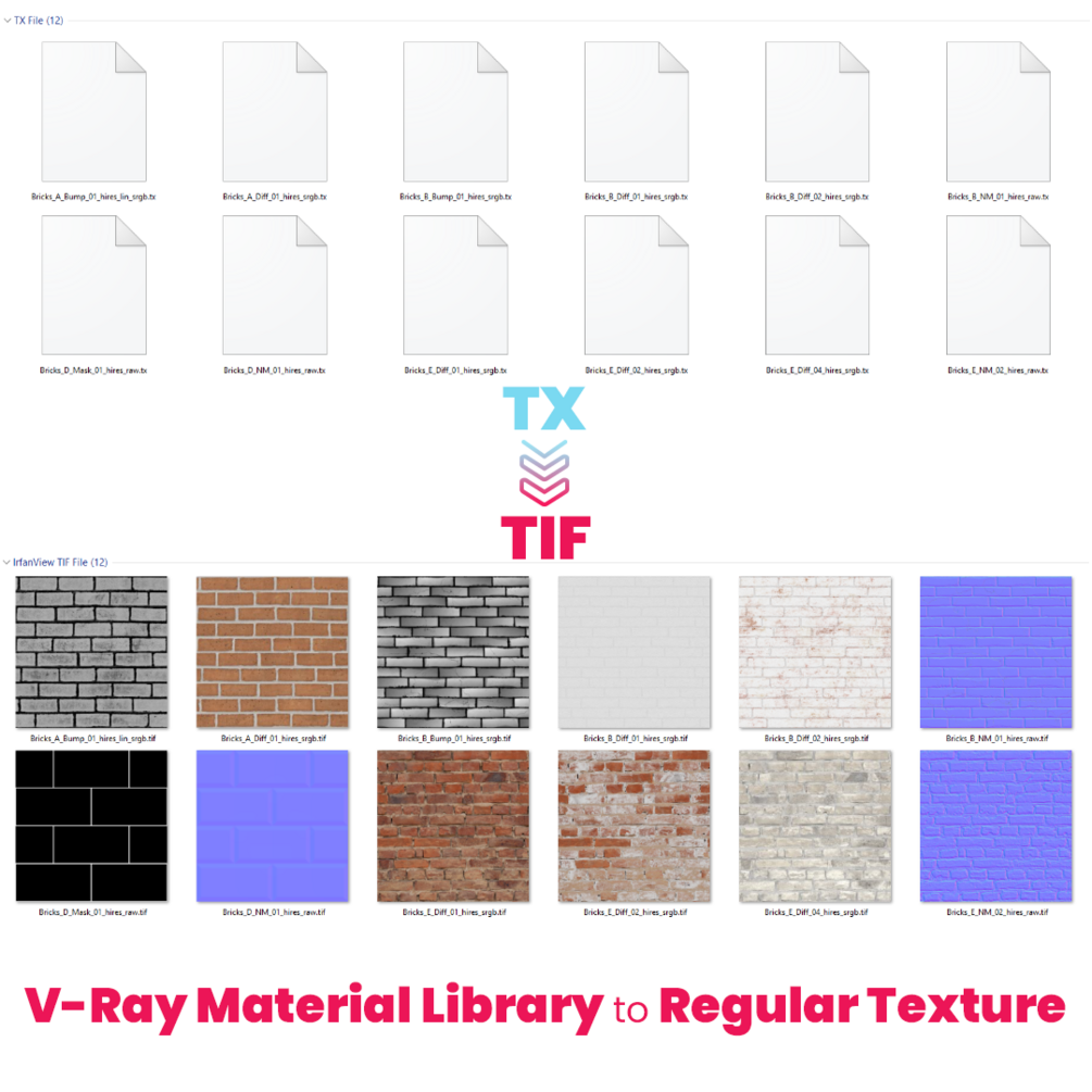 With this tool you can use V-Ray Material Library assets (TX file format) just like any other regular textures (TIF format) in your 3D/2D application of your choice.